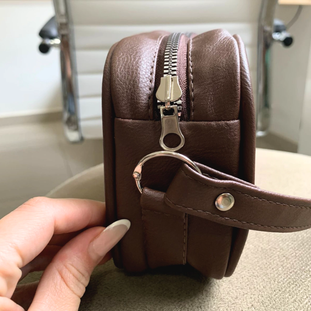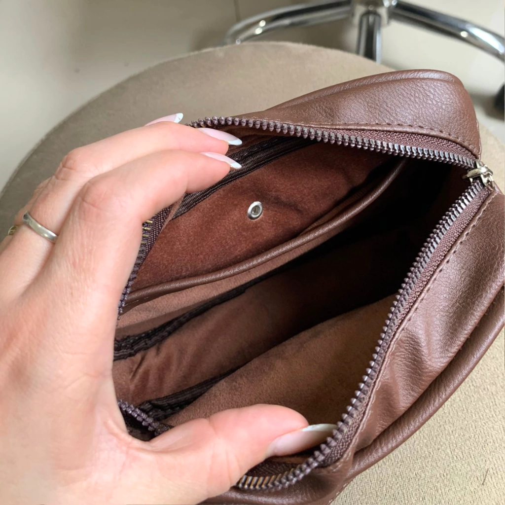 Esta mini bolsa transversal na elegante cor marrom é perfeita para quem busca um acessório compacto e versátil para o dia a dia. Seu design inteligente inclui:
